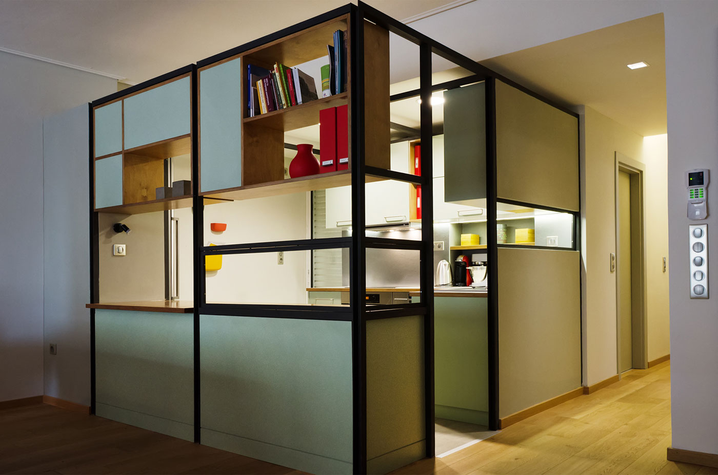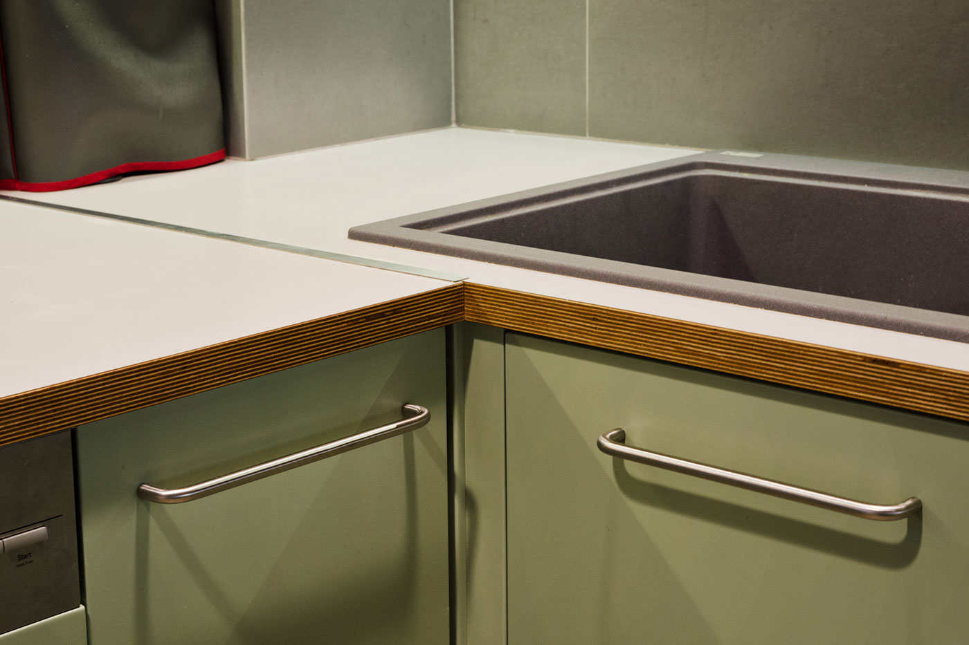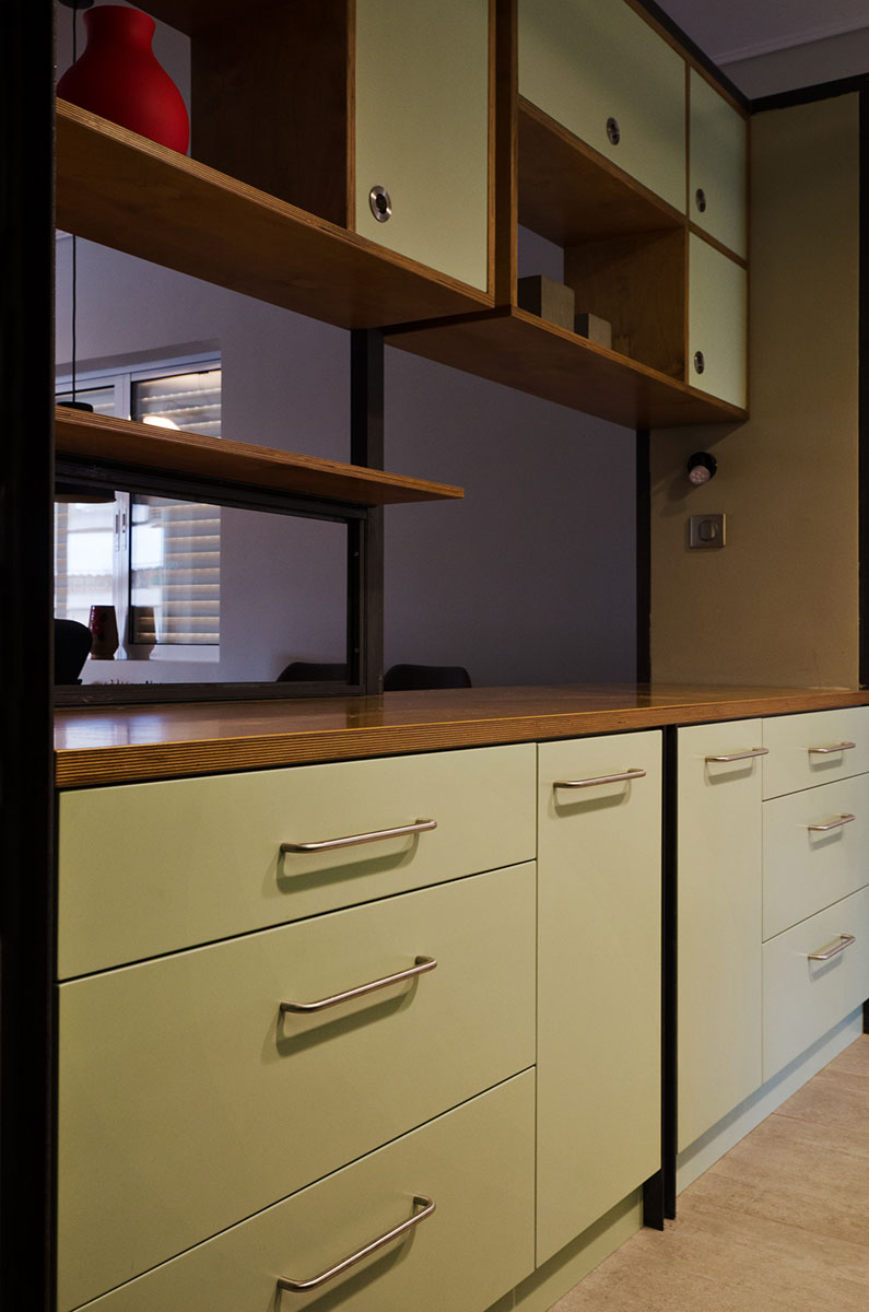 Κουζίνα προσαρμοσμένη σε μεταλλικό σκελετό από Κόντρα Πλακέ Σημύδα και πορτάκια λάκα. Πάγκος από Κ/Π Σημύδα επενδυμένος με Φορμάικα.
