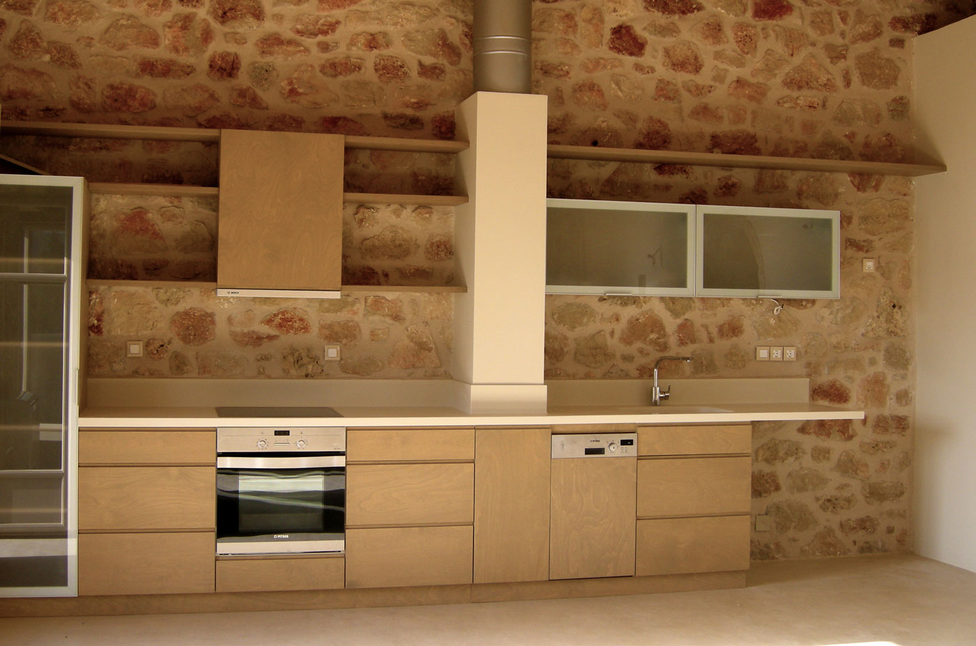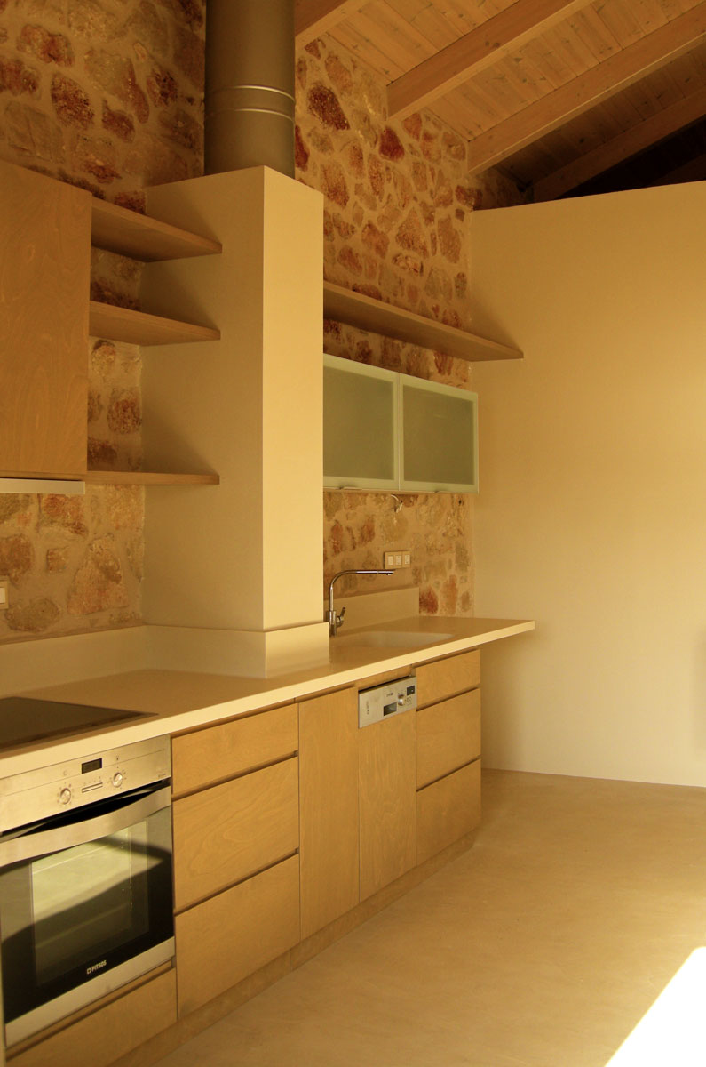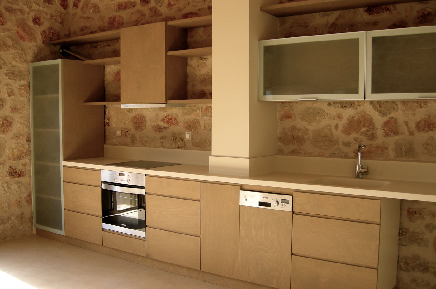 Κουζίνα που συνδυάζει ξύλο σημύδα, inox και corian.